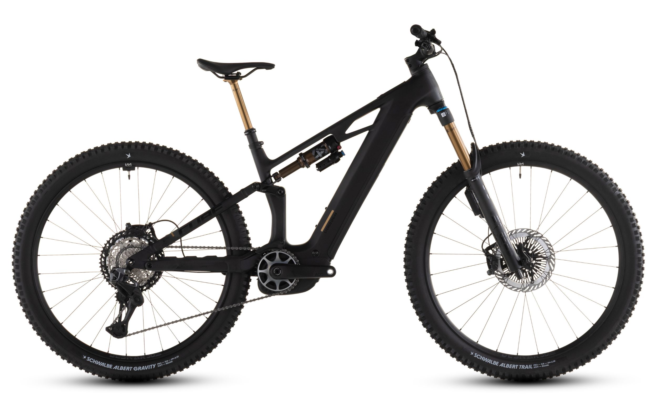 | Banden | voor: Schwalbe Albert Trail Pro, Addix Soft, Kevlar, 2.5, achter: Schwalbe Albert Gravity Pro, Addix Soft, Kevlar, 2.5 |