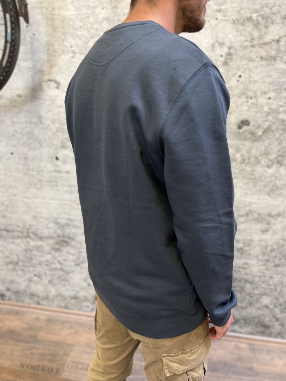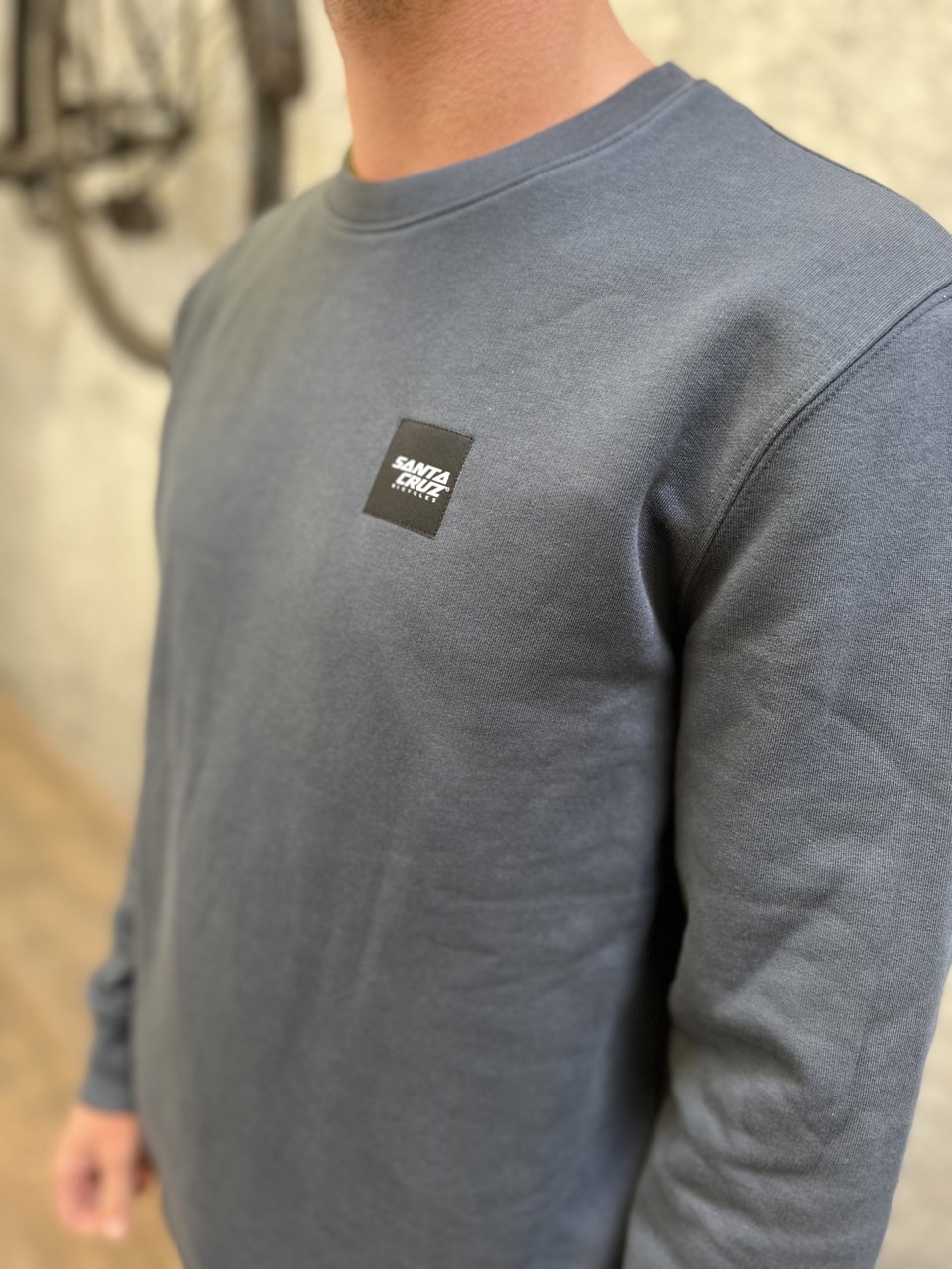 Een sweatshirt in werkkledingstijl met een geweven label van Santa Cruz Bicycles op de borst.