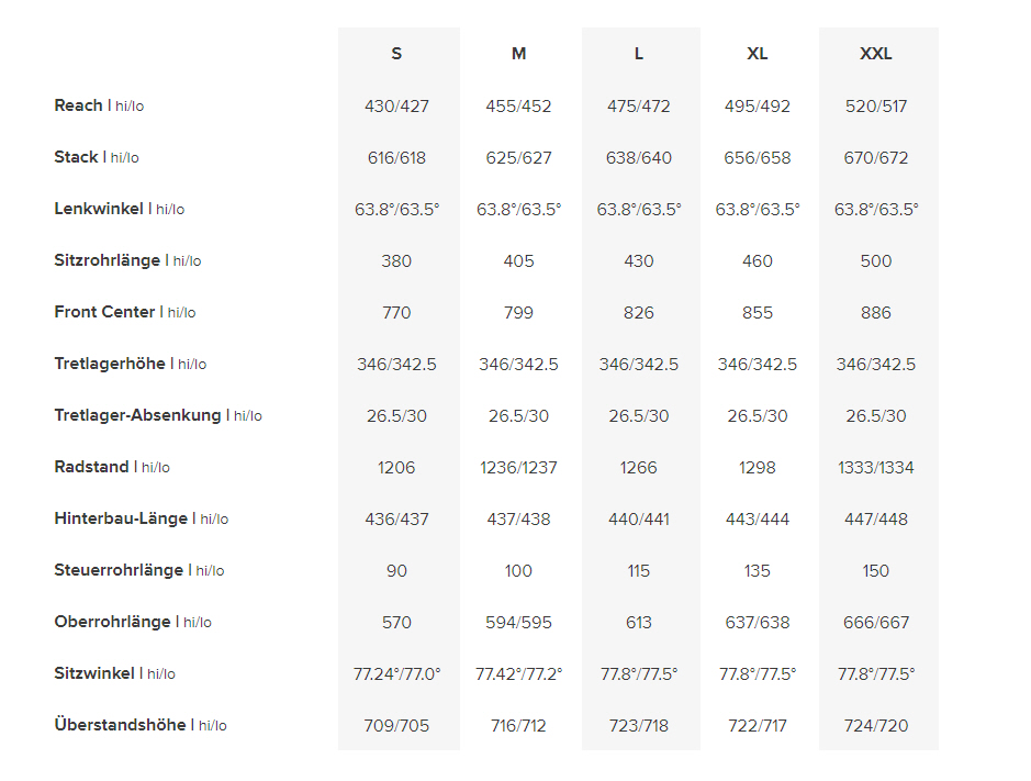 De steile zitbuishoek houdt de rijder gecentreerd op de steile beklimmingen die leiden naar nog steilere afdalingen. De zitbuishoek wordt steiler naarmate de framemaat toeneemt, zodat de balans past bij elke maat.